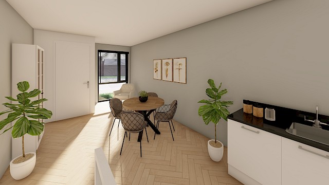 De keuken wordt niet geplaatst, maar de aansluitingen voor water en elektra zijn voorbereid. In overleg kan er een keuken vóór oplevering worden geplaatst. Er is ruim voldoende plek voor een grote eettafel.